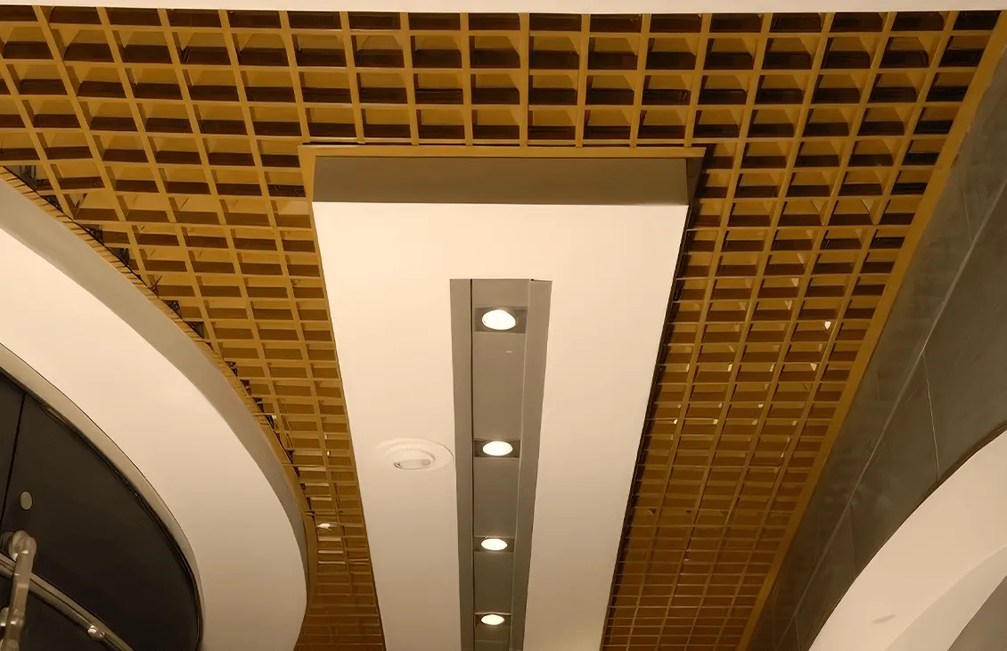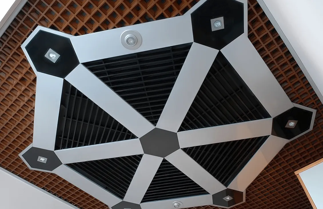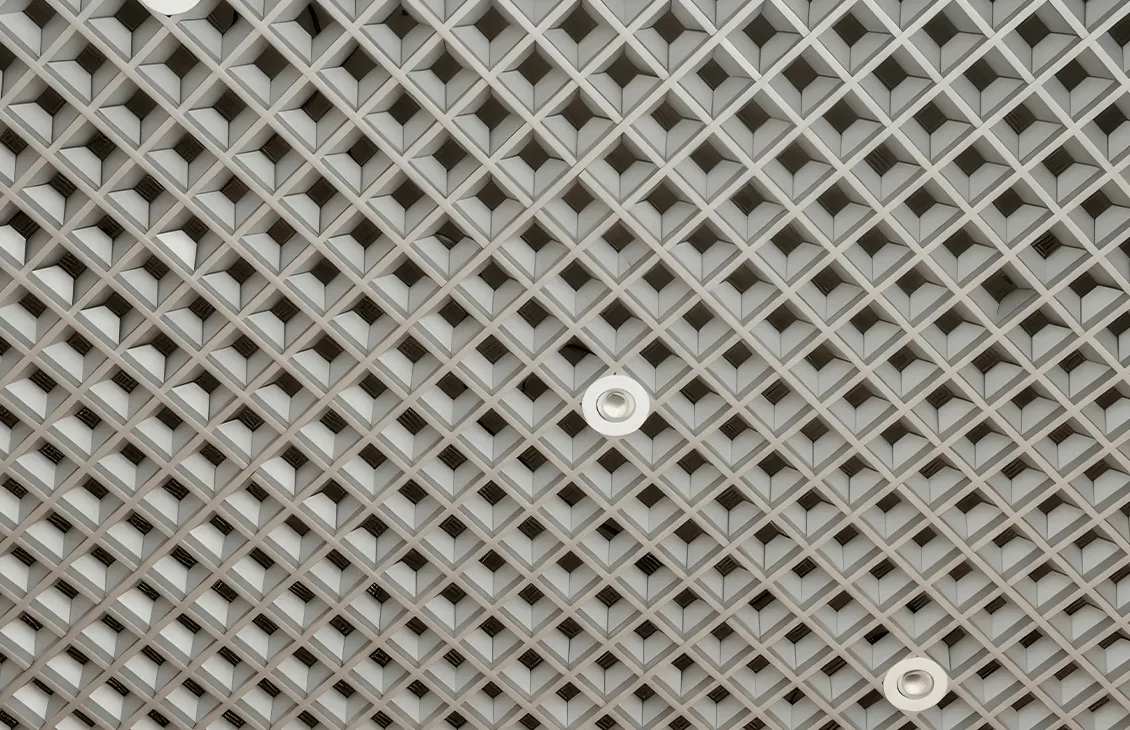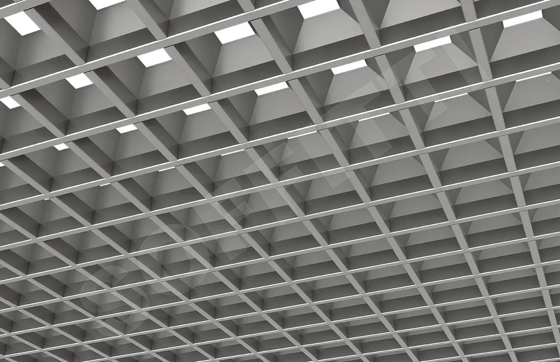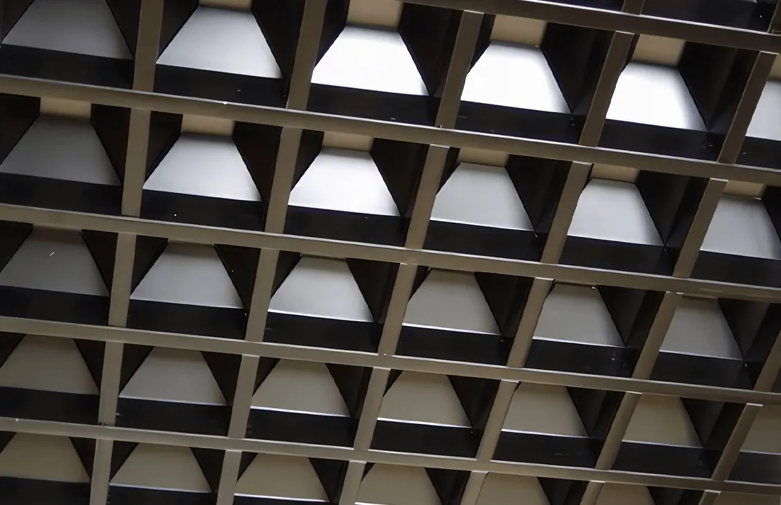- Сложная конструкция: Пирамидальная форма решетки с вертикальным уклоном профилей на 45° позволяет эффективно скрыть запотолочное пространство, обеспечивая чистый и аккуратный вид потолка.