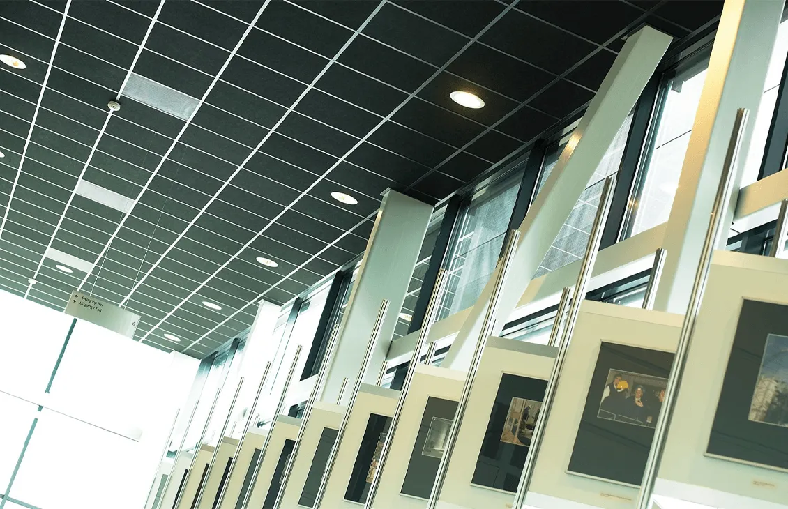 Минеральные потолочные панели Рокфон Индастриал Блэк с черной гладкой поверхностью обеспечивают акустику класса А и подходят для промышленных, офисных и жилых помещений.