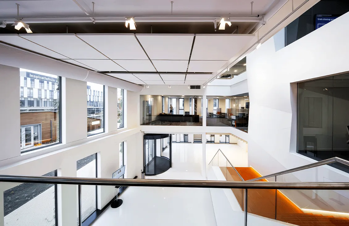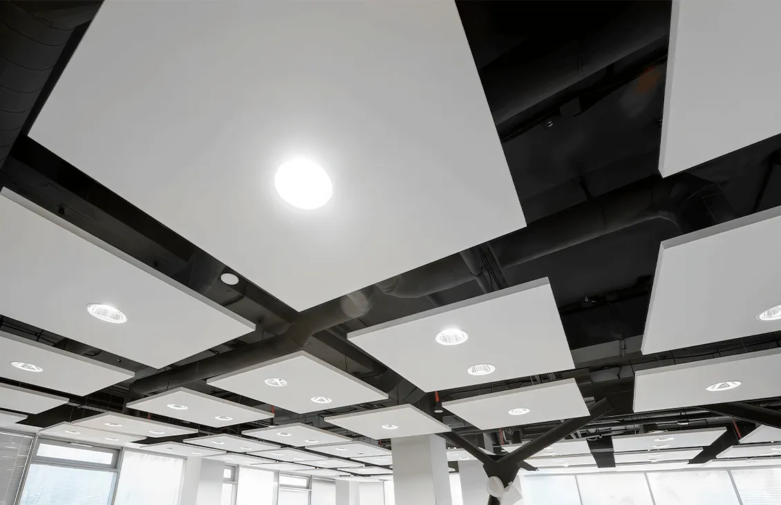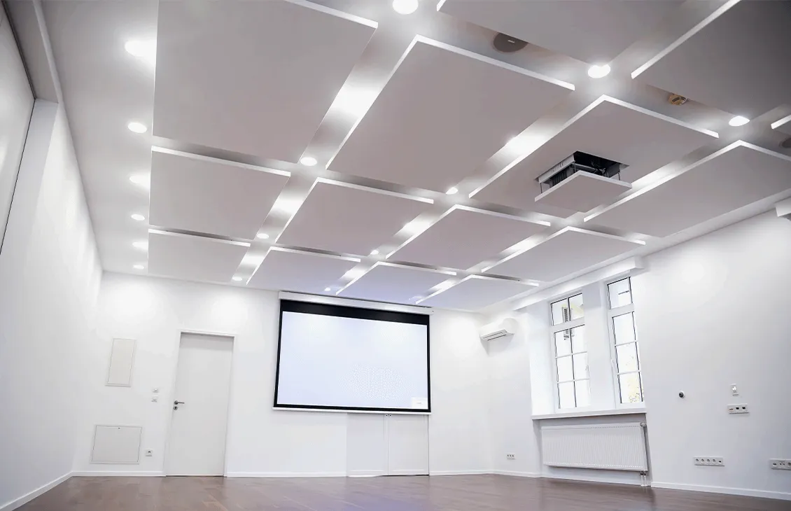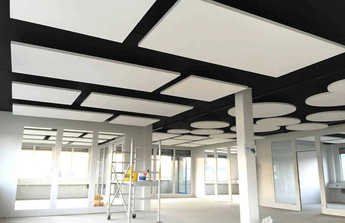 - Офисных пространствах: особенно в открытых и многоплановых офисах, где важна акустика, но желательно сохранить простор и открытость.